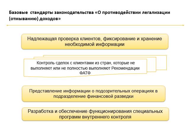 Базовыми элементами законодательства «О противодействии легализации (отмыванию) доходов» являются следующие принципы: